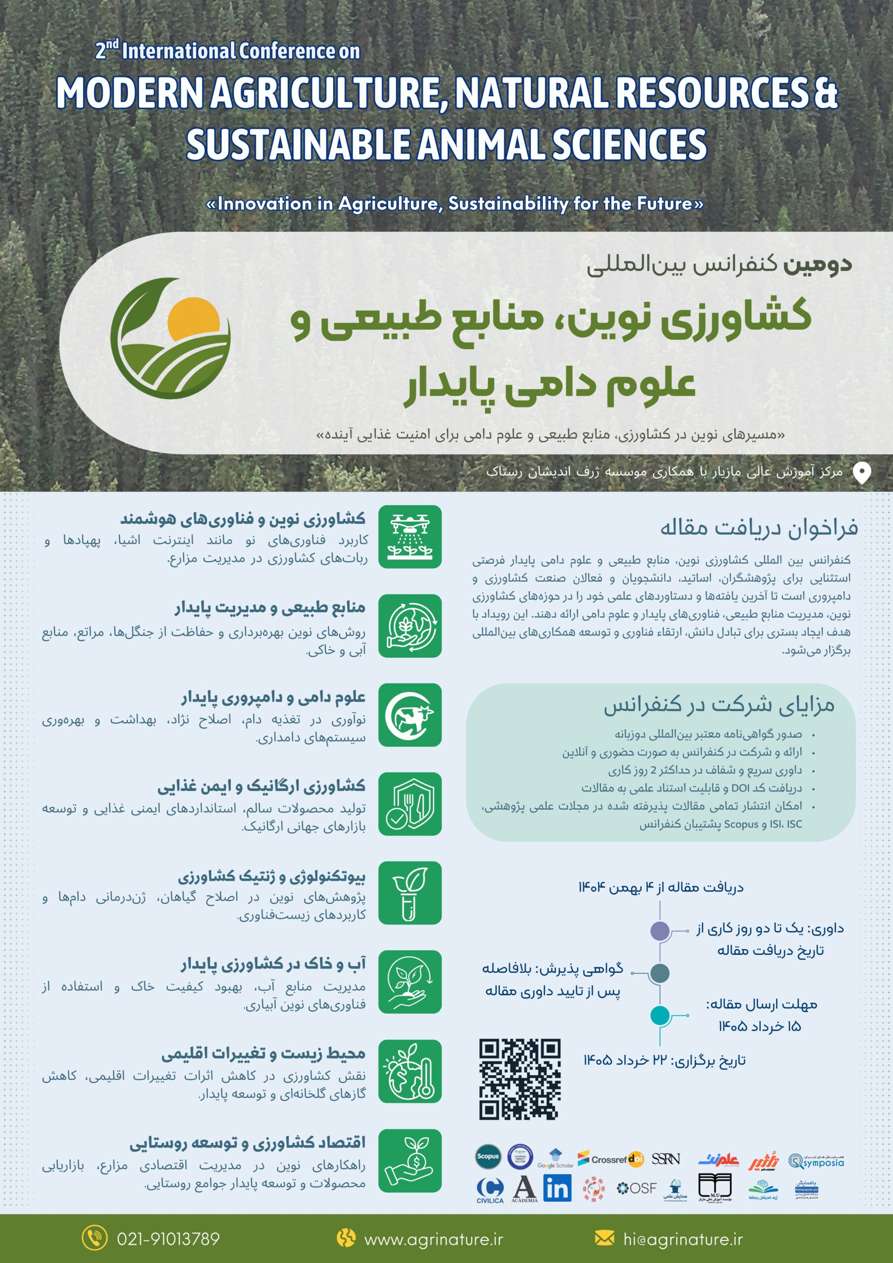 این رویداد علمی با تمرکز بر کشاورزی نوین، مدیریت منابع طبیعی و رویکردهای پایدار در علوم دامی برگزار می شود و بستری برای ارائه پژوهش های کاربردی، تبادل تجربه میان پژوهشگران و متخصصان و داوری سریع مقالات فراهم می کند.